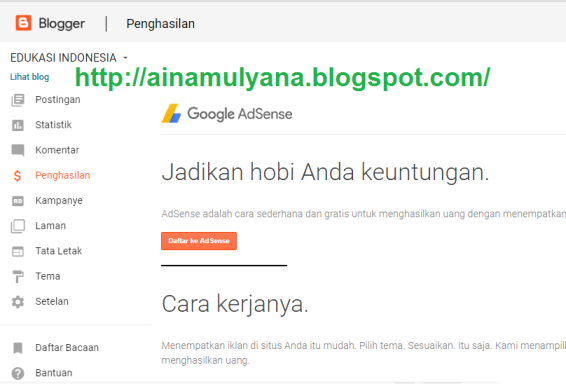 Berikut ini penjelasan Cara Daftar Adsense Melalui laman Dashboard Blogspot setelah tersedia tombol Mendaftar pada Dashboard Blog. Jika tombol Penghasilan Adsense sudah muncul pilih Daftar Ke Adsense maka akan muncul tampil seperti ini.